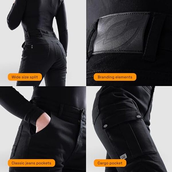 OZONE MOTO Jane Lady Pantalon Jeans de Moto Femme | Doublure en Fibre d'aramide | Protections Genoux Niveau 2 | Poches pour Protections de Hanches et de Coccyx | Poche Cargo | Jogger FitCoupe style Jogger, adaptés pour un usage quotidien après avoir retiré les protecteurs Protect System - Protections de genoux Niveau 2 avec réglage de position, poches pour protecteurs de hanches Taille haute, chevilles élastiquées et l'utilisation d'élasthanne dans le matériel assurent un ajustement parfait et une liberté de mouvement Passants de ceinture sur le pantalon permettent l'utilisation d'une ceinture reliant le pantalon à la veste Poches - Le pantalon possède 5 poches, dont 1 poche type cargo